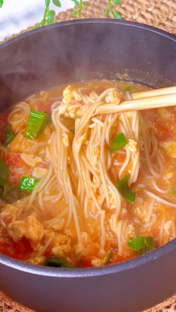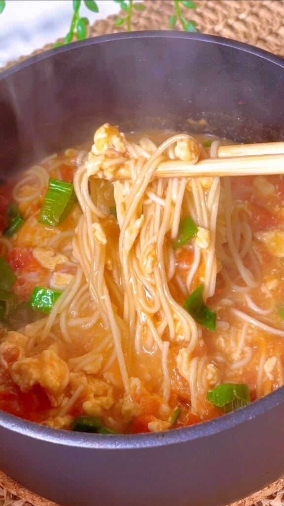 It’s a bowl that’s sweet, sour, savoury, and silky all at once. The tomatoes break down into a slightly thick, tangy broth that clings to the noodles. The eggs are soft and tender, giving it that signature texture.