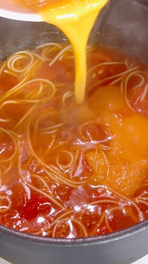 Slowly pour in the beaten eggs in a circular motion over the soup. You’ll see the eggs begin to set the moment they hit the hot liquid. Don’t stir immediately — let it sit undisturbed for 1 minute.