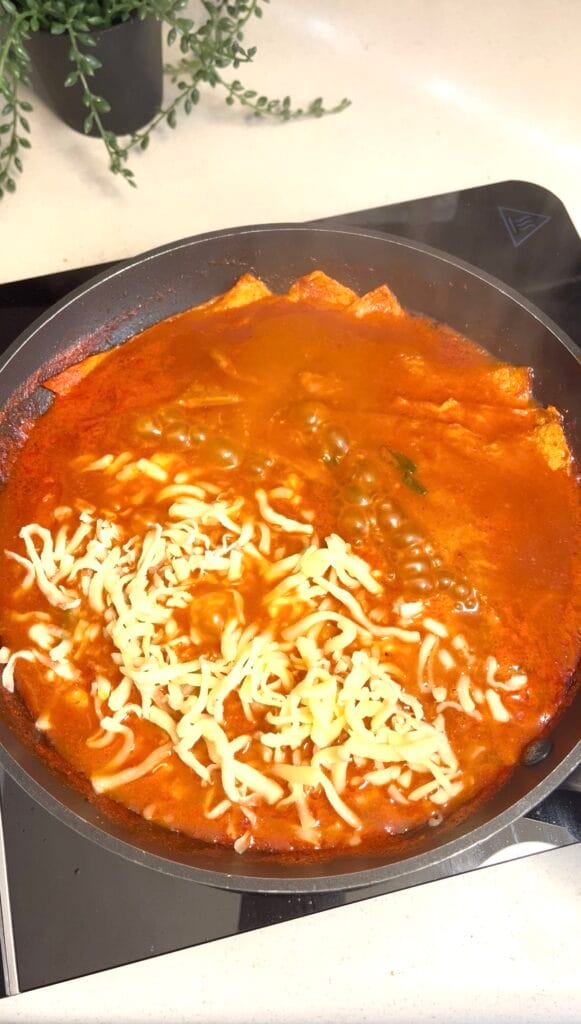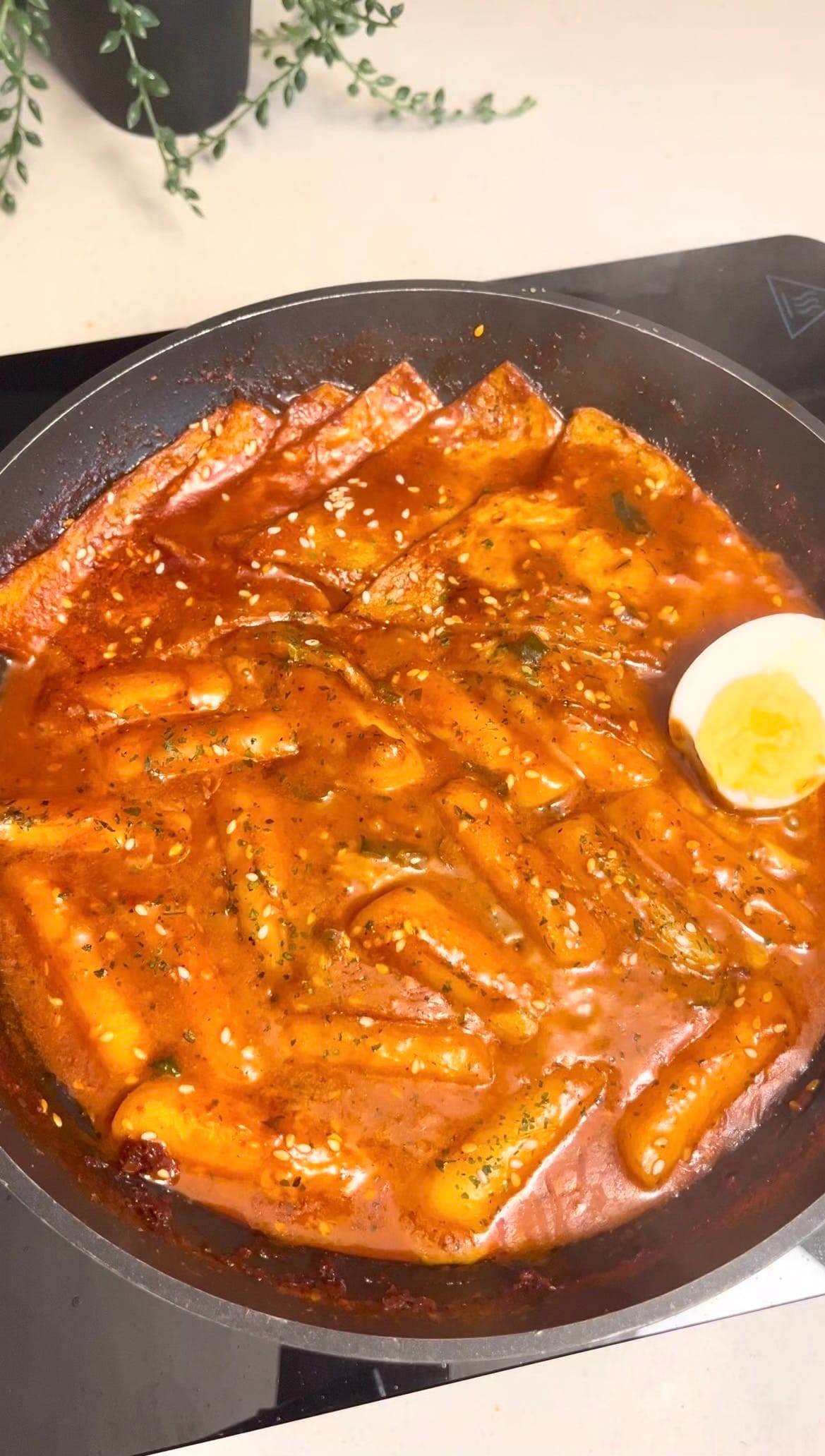 This recipe is my go-to version of tteokbokki which is the one I come back to again and again. The sauce is built from a combination of gochujang and fine gochugaru, which gives it that beautiful deep red colour and layered chilli flavour, balanced with a touch of sugar and soy sauce for sweetness and depth. I use beef dasida stock powder to give the sauce a rich, savoury backbone that makes it taste like it’s been simmering for hours even though it hasn’t. The fish cakes add another layer of flavour and that classic Korean street food character, the boiled egg soaks up all the sauce and is absolutely divine, and the cheese. Oh, the cheese. Piled high, melted low and slow until it’s completely gooey and golden at the edges. It’s everything.