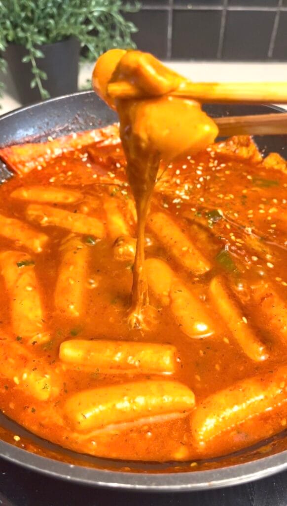If you’ve ever scrolled through Korean street food videos online and found yourself completely mesmerised by that iconic shot of glossy red tteokbokki being lifted from a bubbling pan with strings of melted mozzarella stretching dramatically behind it, you are in exactly the right place, because today we are making that at home and it is every bit as good as it looks.