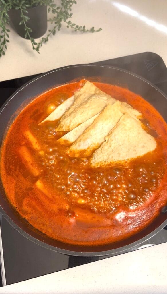 Add 2 slices of fish cake (cut into pieces) directly into the sauce. Stir gently to make sure everything is submerged in the sauce and coated well. Then, place the lid on the pan. Stir every 2–3 minutes to prevent the rice cakes from sticking to the bottom of the pan.