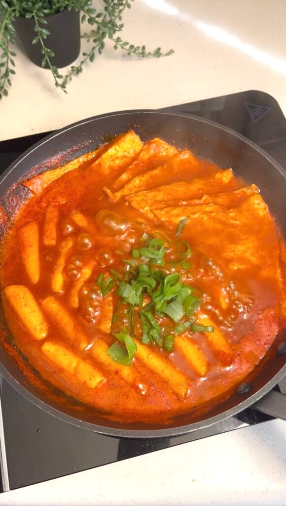 Once the rice cakes are cooked through and the sauce has reduced to a gorgeous, thick, glossy consistency, add 2 tbsp of roughly chopped spring onion directly into the pan. Stir everything together well so the spring onion is evenly distributed throughout the rice cakes and sauce. The spring onion will wilt slightly from the residual heat of the dish and adds a lovely fresh, mild onion flavour that lifts and brightens the rich, spicy sauce beautifully.