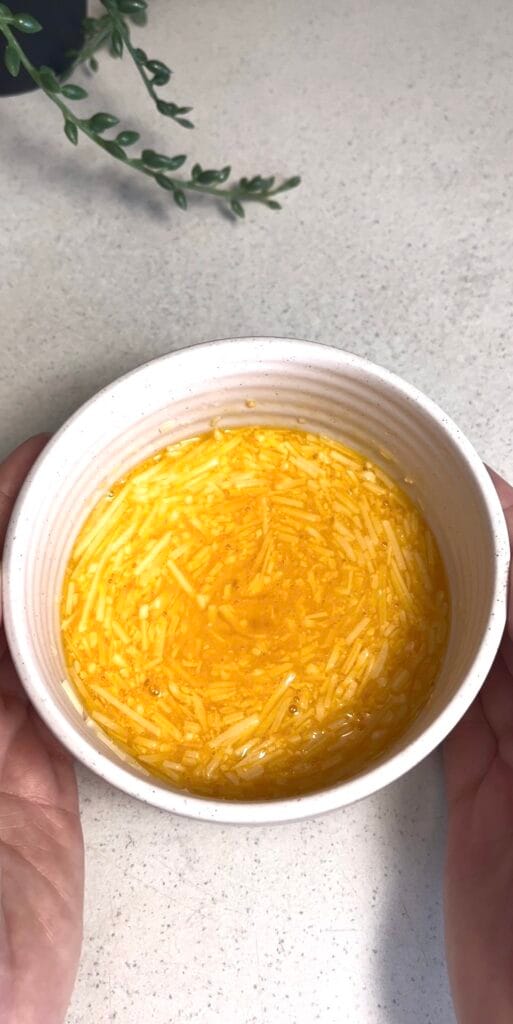 While cooking the pasta, crack 1 egg yolk and 1 whole egg into a medium bowl. Whisk them together thoroughly until completely combined and uniform in colour. No streaks of egg white should remain. Then add 1/4 cup of finely grated parmesan cheese and whisk it through until fully incorporated. The mixture should look thick, slightly pale, and smooth with no lumps of cheese remaining.