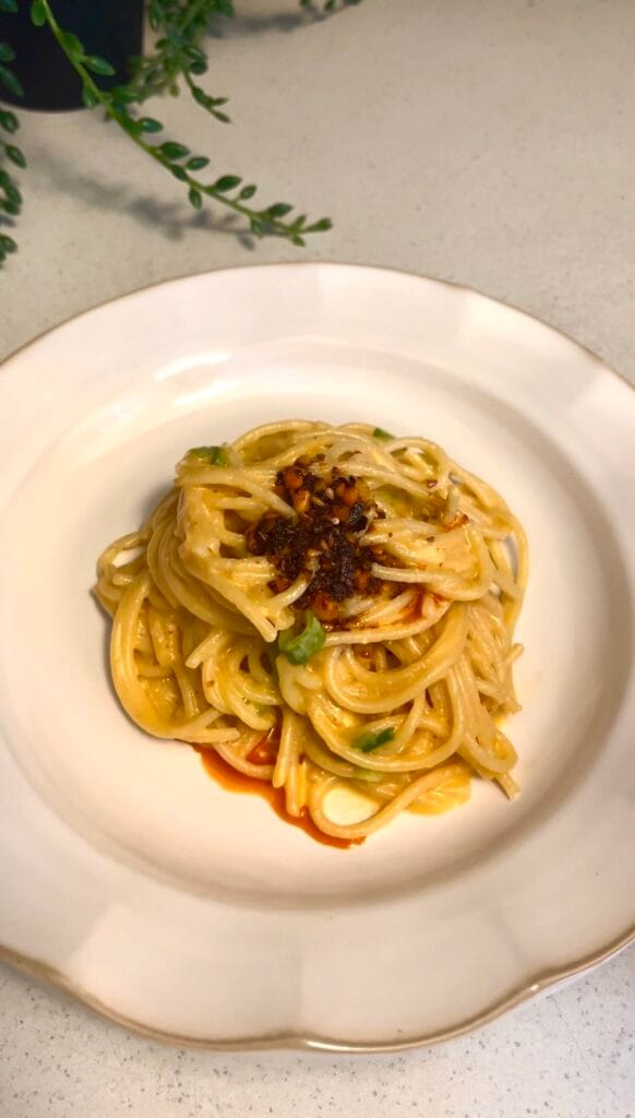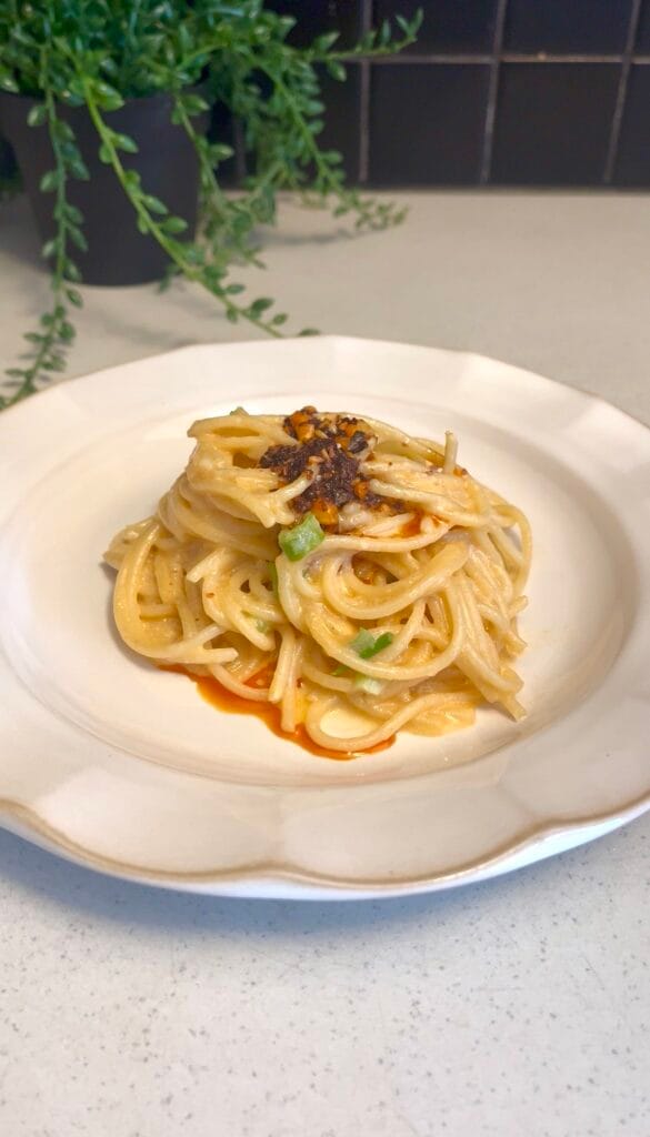 Silky, spicy, and on the table in 20 minutes — this chilli oil carbonara is made with a glossy egg and parmesan sauce, fragrant chilli oil, thinly sliced garlic, and spring onion. No cream, no fuss, just pure flavour.