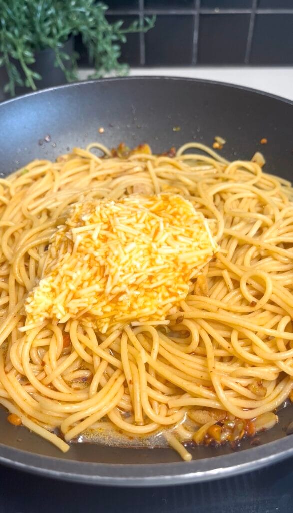 Add the cooked pasta directly into the pan with the chilli oil and aromatics. Toss well with tongs to coat every strand thoroughly in the oil and get the garlic and spring onion evenly distributed through the pasta. Then immediately pour the egg and parmesan mixture over the pasta all at once. Working quickly and confidently, toss everything together continuously and vigorously. keep the pasta moving at all times using tongs or two forks. As you toss, add pasta water in small splashes. Start with about 2–3 tbsp and toss it through before adding more. The pasta water does two crucial things simultaneously: it cools the egg mixture just enough to prevent it from scrambling, and it helps emulsify everything into that silky, flowing, glossy sauce.