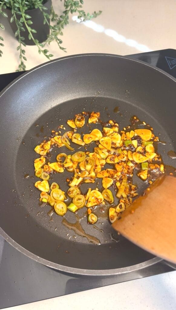 Heat 1 1/2 tbsp extra virgin olive oil and 1 tbsp chilli oil in a large wide pan or skillet over medium heat. Once the oil is warm and shimmering, add 1 tbsp of thinly sliced garlic and 1 tbsp of finely chopped spring onion. Reduce the heat to medium-low and sauté gently and stir frequently. You’re watching for the garlic slices to become tender and just barely golden at the very edges, and for the spring onion to soften and become fragrant. The garlic should look translucent and lightly golden, not brown or dark.