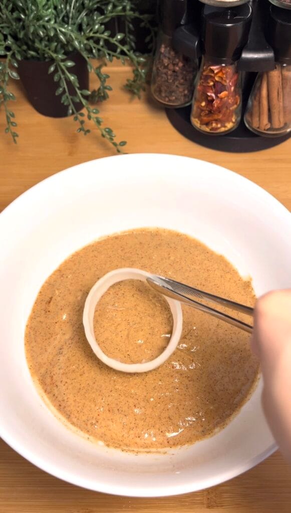 • Coat the onion rings: Dip each onion ring into the wet batter, letting excess drip off, then coat evenly in the dry mixture. Press gently so the crumbs stick well.