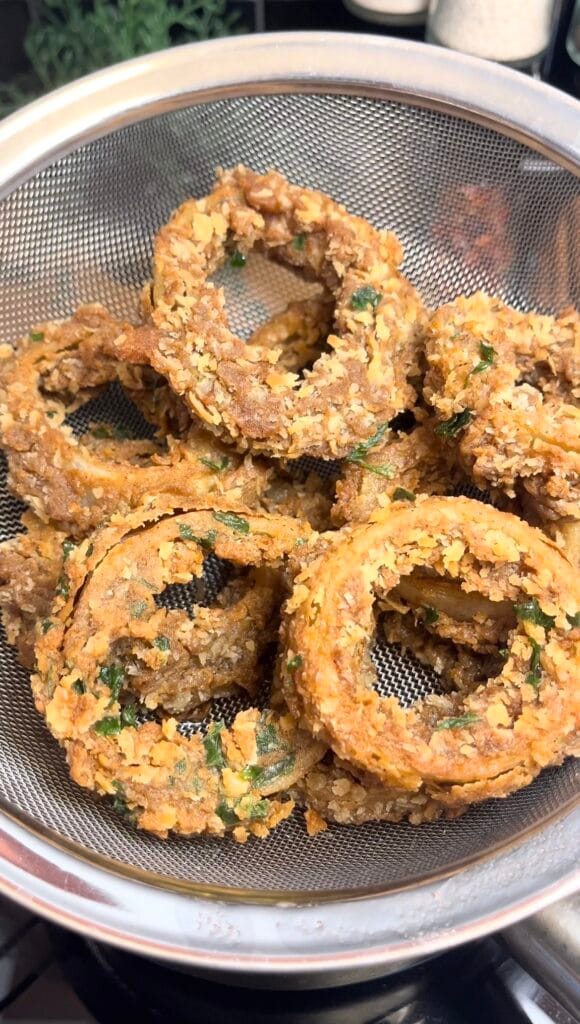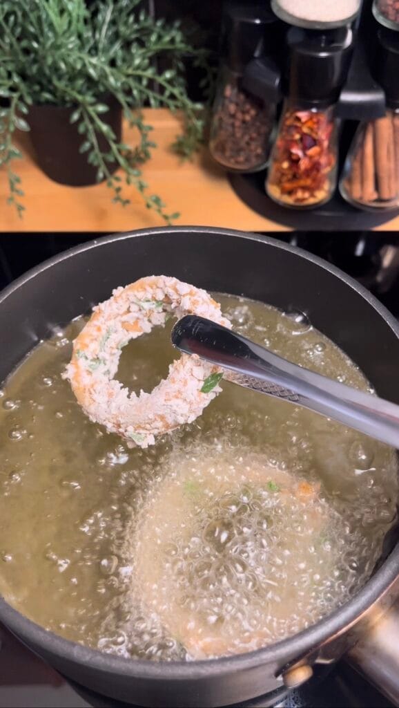 ❤️ Tip: Don’t slice the onions too thin. Thin rings soften too quickly and won’t give you that juicy centre once fried.