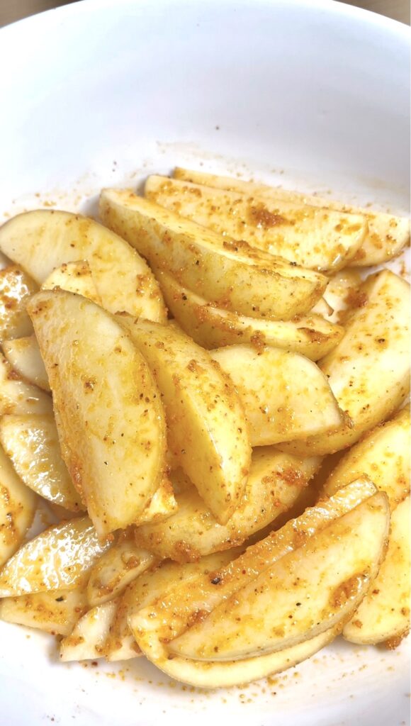 Don’t rush this step. Proper coating is what gives you even colour and flavour. If needed, separate the wedges and mix again to ensure full coverage.