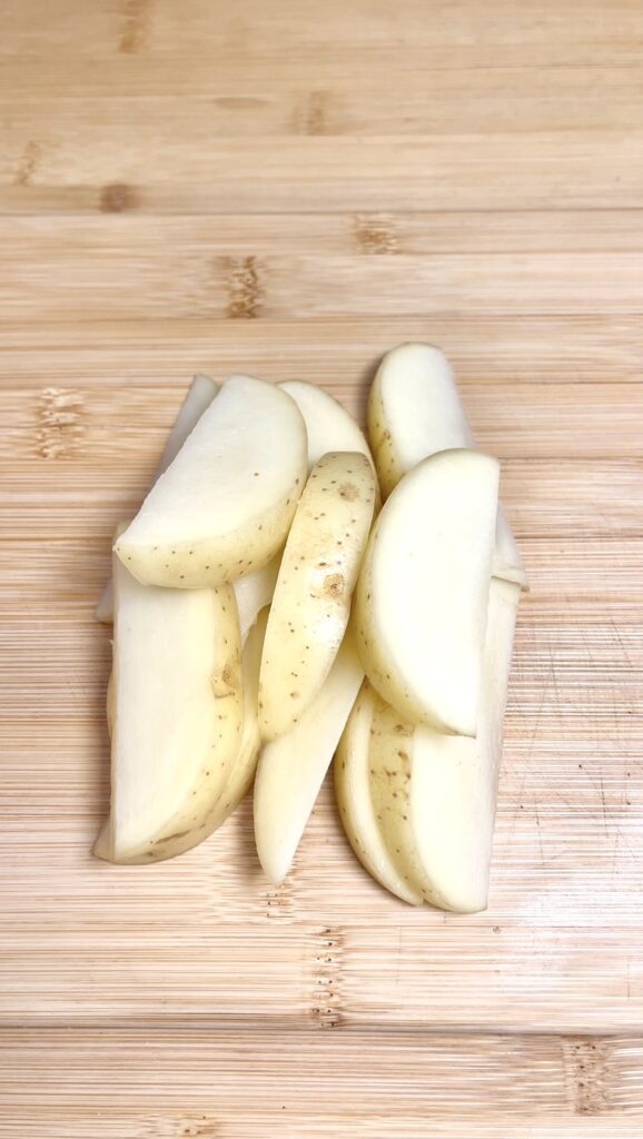 Cut each potato in half lengthwise using a sharp knife. Then place each half flat-side down on the chopping board and cut into wedges, about 6–8 wedges per half depending on the size. Smaller potatoes may only give you 5–6 wedges per half.