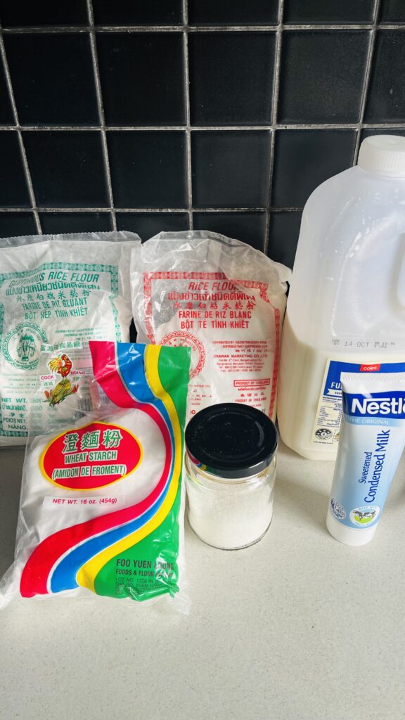 - In a large bowl, whisk together glutinous rice flour, rice flour, wheat starch, sugar, condensed milk, and milk until smooth.