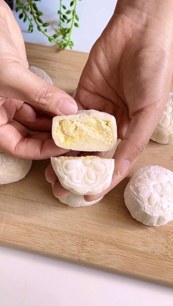 Soft, chewy, and filled with creamy durian — these snow skin mooncakes are the ultimate tropical treat for Mid-Autumn Festival. The skin is cool and tender, almost mochi-like, while the filling is rich, smooth, and bursting with that signature durian aroma.