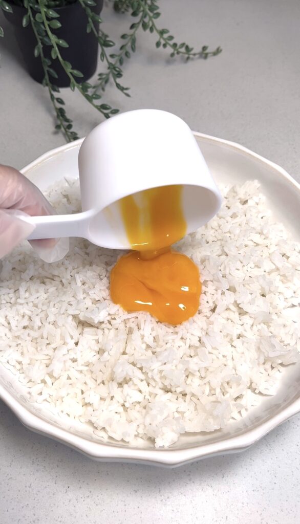 Add the 2 reserved egg yolks, 1/2 tsp salt, and 1 tsp white pepper directly into the rice. Mix thoroughly using your hands or a spatula until every grain is lightly coated and the rice turns a yellow colour.