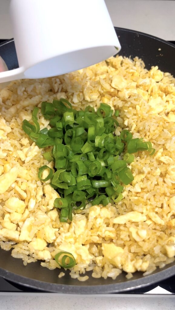 - Add spring onions and finish: Push rice to the sides. Add 1 tsp oil (optional) and 1/2 cup spring onions to the centre. Cook for 20–30 seconds until fragrant, then mix through. Taste and adjust with extra salt if needed.
