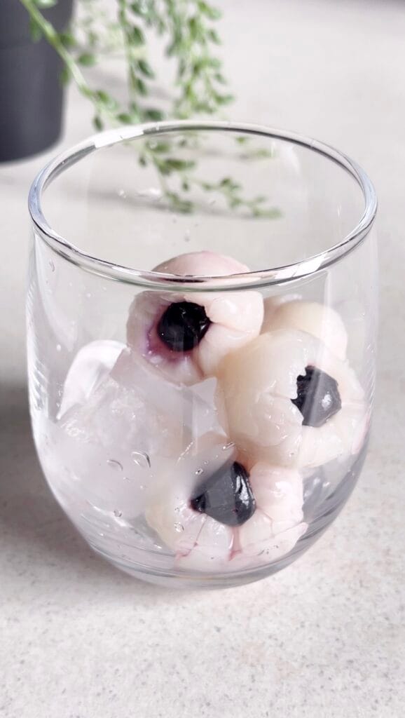 Fill it halfway with ice cubes. Then, carefully drop in your lychee eyeballs one by one. Some will float, some will sink — that’s the spooky part! The contrast of the white lychee and the dark “pupil” inside looks just like something watching you from the depths.
