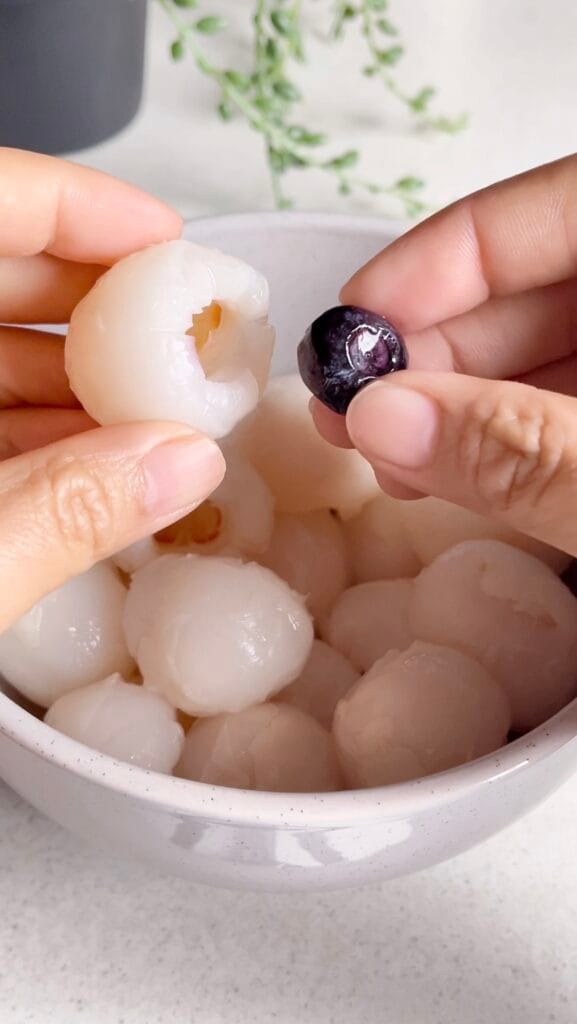 Start by draining your canned lychees. If they’re packed in syrup, give them a quick rinse under cool water to remove the extra sweetness — this also helps them grip the blueberry better.